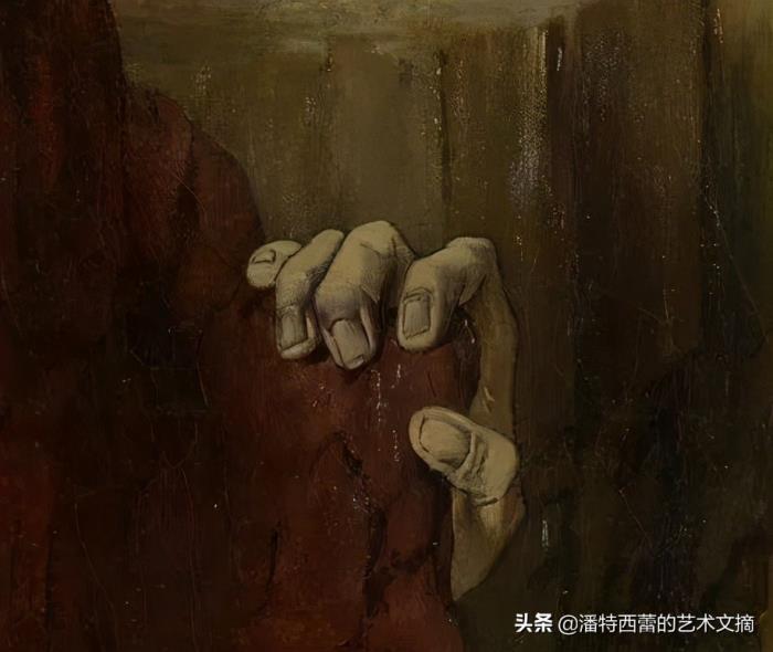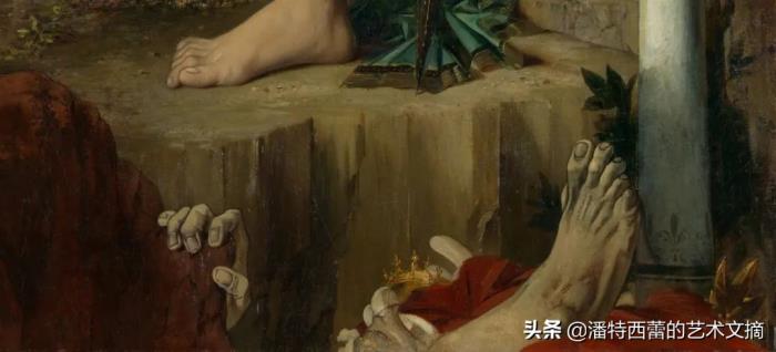 在几乎斩掉的前景上,他沉船一般,只有一只脚从岩石中浮了出来。还能看到他那绛红袍子、顶冠、一只手。摔倒的君主,被废黜一般,依然抓着岩石,挂在画上。