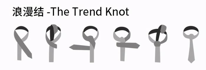浪漫结的线条非常柔美,是一种完美的结型,给人整洁、浪漫的印象。这种领带打法的特别之处在于,它可以自由调节长度,窄边的位置也可以左右微调。