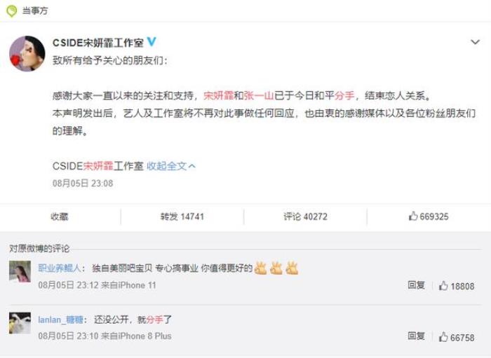 事发不足24小时,宋妍霏官宣,与张一山和平分手。