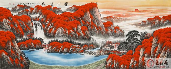 此幅《宝山富水》是陈厚刚聚宝盆作品的一幅鸿运风水画题材的山水作品。画面中的祥云高照代表鸿运当头,事业蒸蒸日上。流淌的瀑布代表着财源滚滚、生生不息的含义,充沛的水源汇流形成聚宝盆的形状,意味着水不外流,即财不外流,也就是招财聚宝盆。两旁的古松寓意左招财右挡灾,也寓含事业长青之意。山水画源远流长,风水文化千古流芳,本作品体现了山水画与风水的有机结合。背山面水,山环水抱;后有靠山,前有财源,左右“青龙、白虎”护卫,这是一幅非常完美的聚宝盆山水画。
