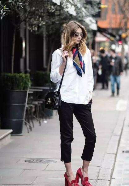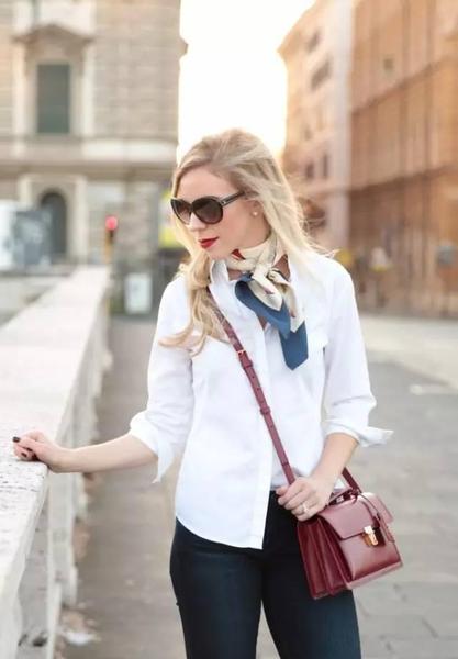 基础款白衬衫搭配一条丝巾立马像换了一个新的造型。