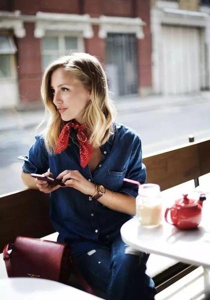 著名小个子博主把牛仔衬衣搭配红色丝巾优雅又时尚,红蓝搭配看起来非常养眼。