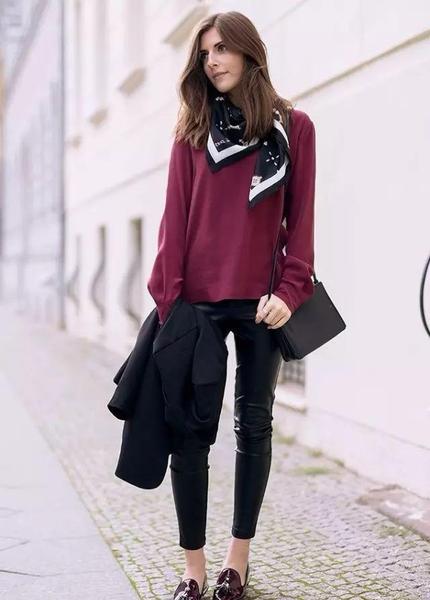艳丽的毛衣搭配一条素色丝巾可以提升造型的质感,更加高级耐看。