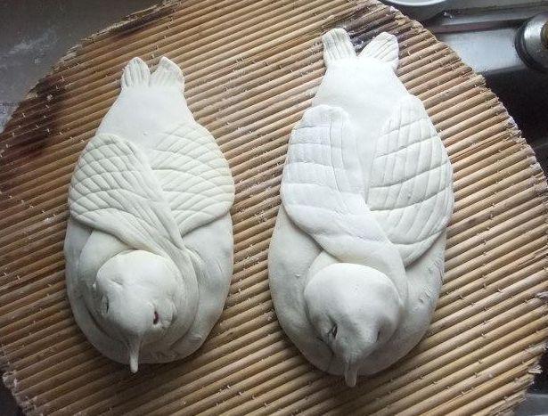 以赤豆装点2只眼睛,再为其增添丰满的羽翼,成就了栩栩如生的老雁形象。经过数十道的工序,一个个活灵活现的老雁馍脱颖而出,盖上大红寿字,寓意着父母平安。