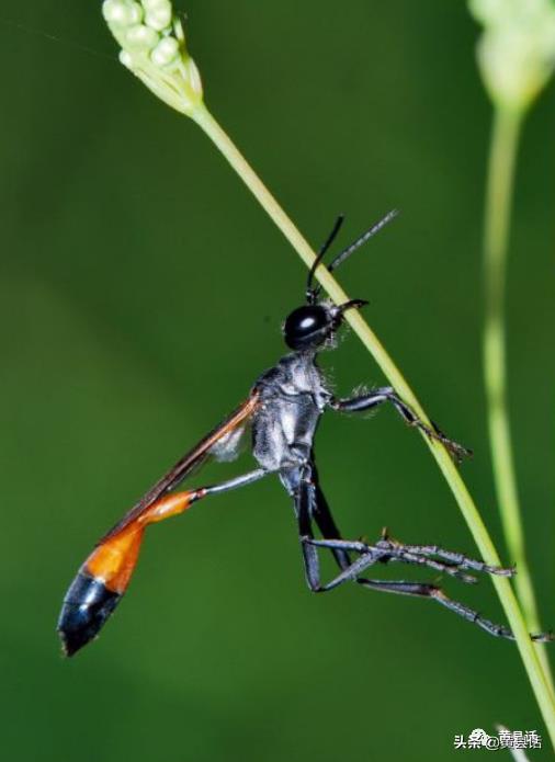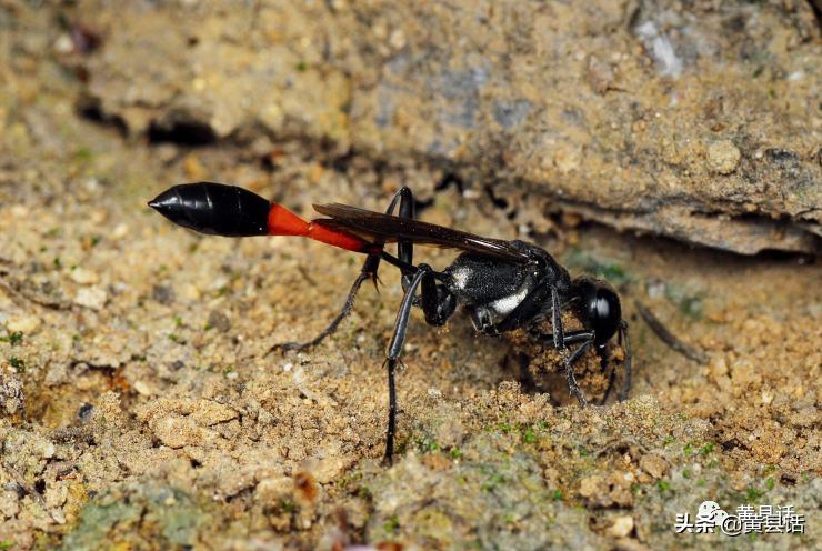 水塘边的沙地上,经常停着一只身材修长的蜂子,像在挖掘什么。