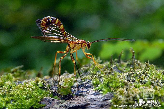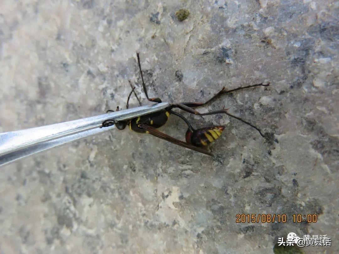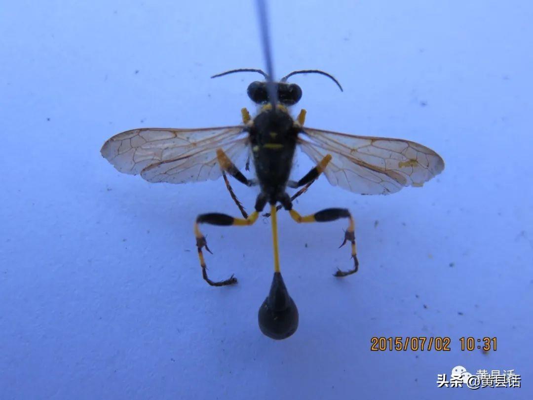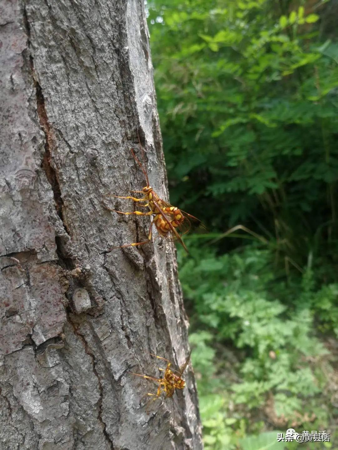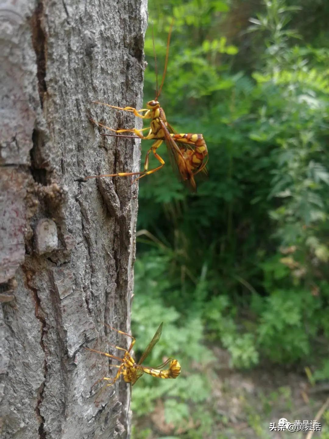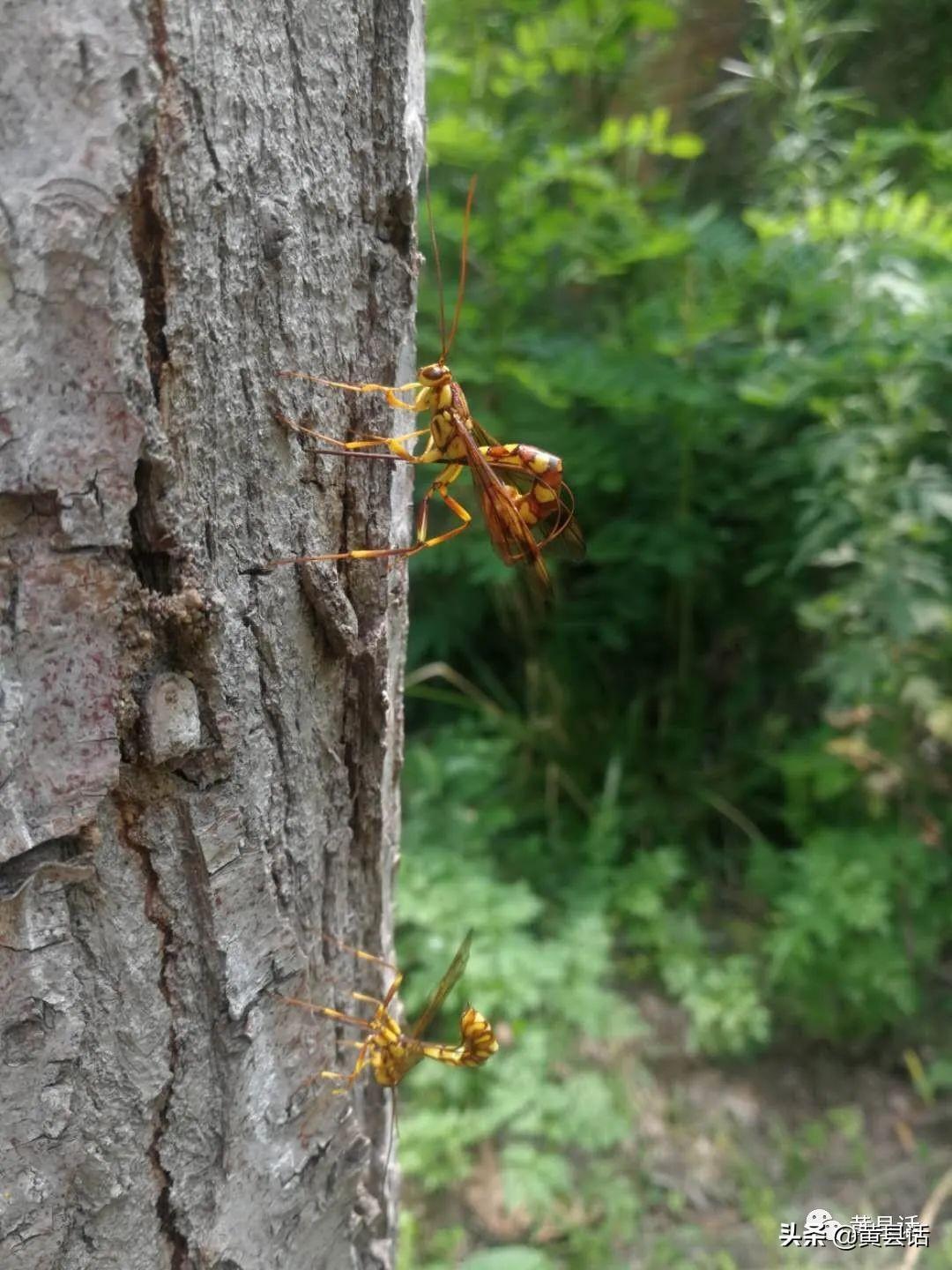 第二天,我路过那棵杨树,出于好奇,走过去看看那只香水牛还在不在了。没看到香水牛,却看到两只从来没见过的蜂子,体色淡黄褐色,体形纤细苗条,腹部具红色的环纹,脚细长得像大蚊子一样。它的体长有三四厘米,后面却有六七厘米长的尾针,足有体长的一倍。