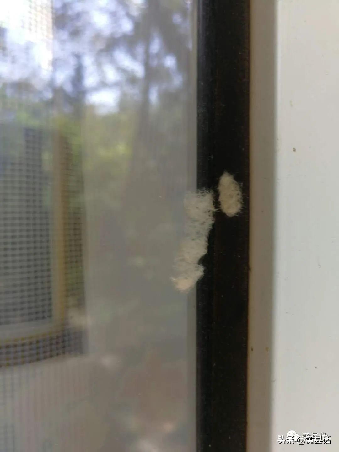 旁边的玻璃门上,黏着一小块不规则的灰白色物质,外面覆有泡沫状白色胶质物,样子有点像春末的杨絮。看来这是一只产后小憩的蛾妈妈。