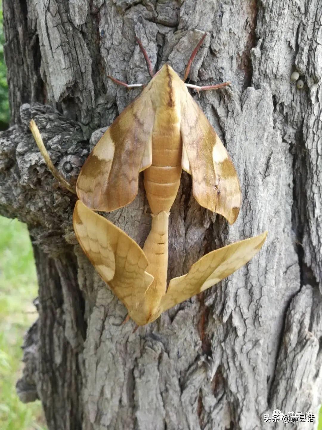 那天路过一片刺槐林,眼角瞥见一棵树灰黑色的树皮上,有一块菱形的沙漠迷彩样的斑块,凑近一看,原来是两只豆天蛾在爱爱,只是这古怪的姿势还是第一次看到,倒像是在拔河。