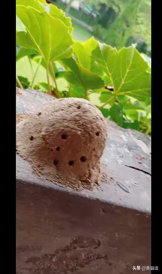 另有一天,我在楼上阳台矮墙的立面上看到一个泥做的小窝窝头样的蜂巢,上面开着几个眼儿,显见里面的蜂子已经孵化离开了。