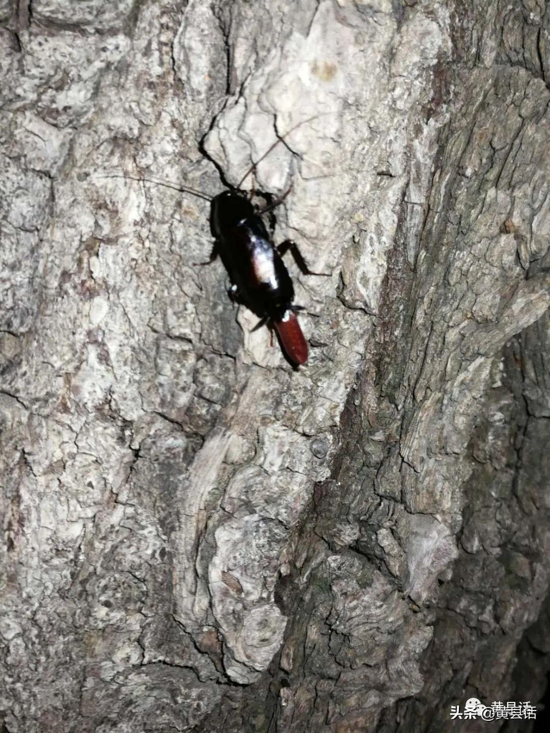 有天晚上,我出去摸老猴儿,在一棵老柳树上,照到一只黑褐色油亮油亮的小虫子,有两只长长的触角,体长有二三厘米,翅膀很短,像马甲一样紧紧贴在背上,看样子像蟑螂,但身材显得娇小,纤细狭长,它的屁股后面拖着半截比身体窄不了多少的卵鞘,真怀疑它是怎样产出来的。