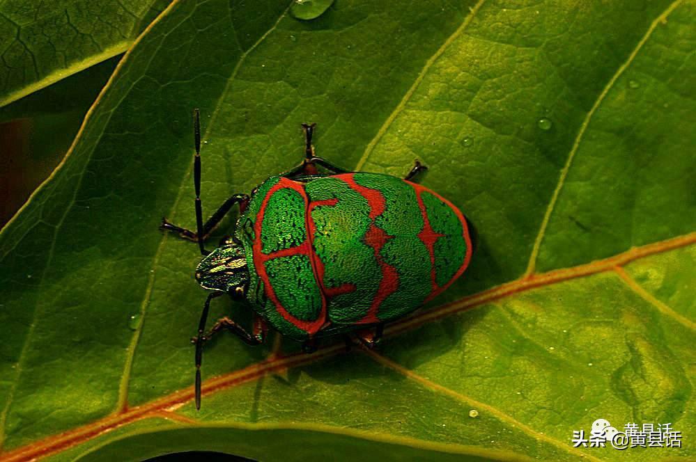 这位却高调极了,宽椭圆形的身体,通体是金绿色,具赭红色斑纹,前胸背板有一个横置的“日”字形纹。这么大胆、艳丽的色彩搭配,我只在秧歌队的大妈身上见到过。后来问过朋友,才知这是半翅目盾蝽科宽盾蝽属,学名金绿宽盾蝽,又称红条绿盾背蝽象。主要危害侧柏、荆条、元宝槭、构树等,成虫和若虫皆吸食寄主的嫩芽、嫩叶和果实的汁液,造成果实干瘪脱落,枝叶枯萎,是很厉害的林业害虫。金绿宽盾蝽七八月交配,雌虫产卵于侧柏的新鲜枝叶正面,以若虫过冬,来年五至八月再羽化为成虫。据资料上讲,成虫臭腺发达,其腹部背面有3对臭腺孔,我很庆幸自己没有触碰它。