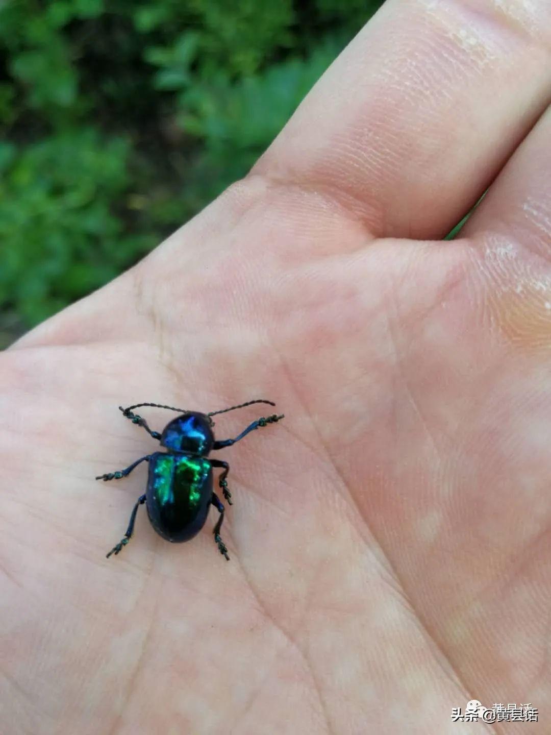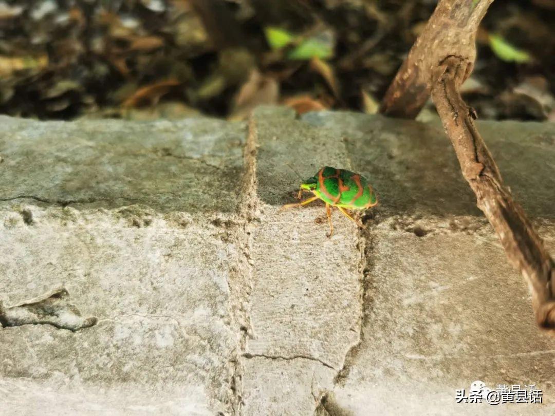 那天我正在林子里散步,前面黑色玄武岩铺就的甬路上爬着一只颜色异常鲜艳的甲虫,我仔细一看,不禁有些吃惊,从外形看,它有点像蝽象,梨蝽象黄县话叫“臭大姐”,一身灰不黢黢的打扮,朴素得不能再朴素了,趴到梨树上就像隐形了一样。