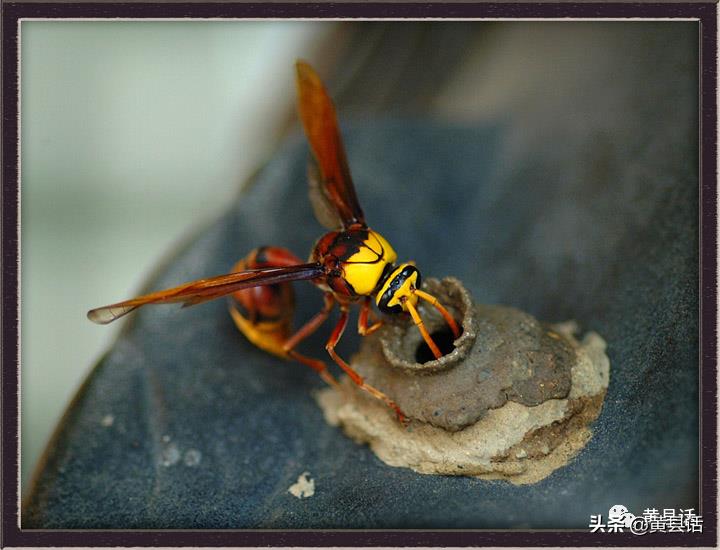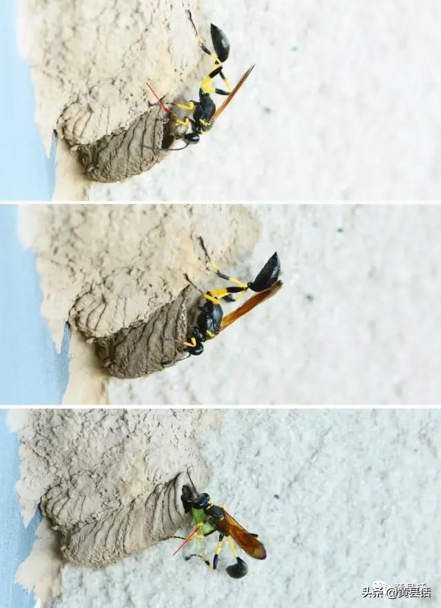 蜾蠃的巢是带卷边的泥壶状,像个精巧的工艺品,因此得名“泥壶蜂”,与之相比小土窝头实在太土了,毫无艺术性可言。还有某些泥蜂用唾液与泥土混合成水泥状坚硬的巢,其中壁泥蜂属便是如此筑巢的。