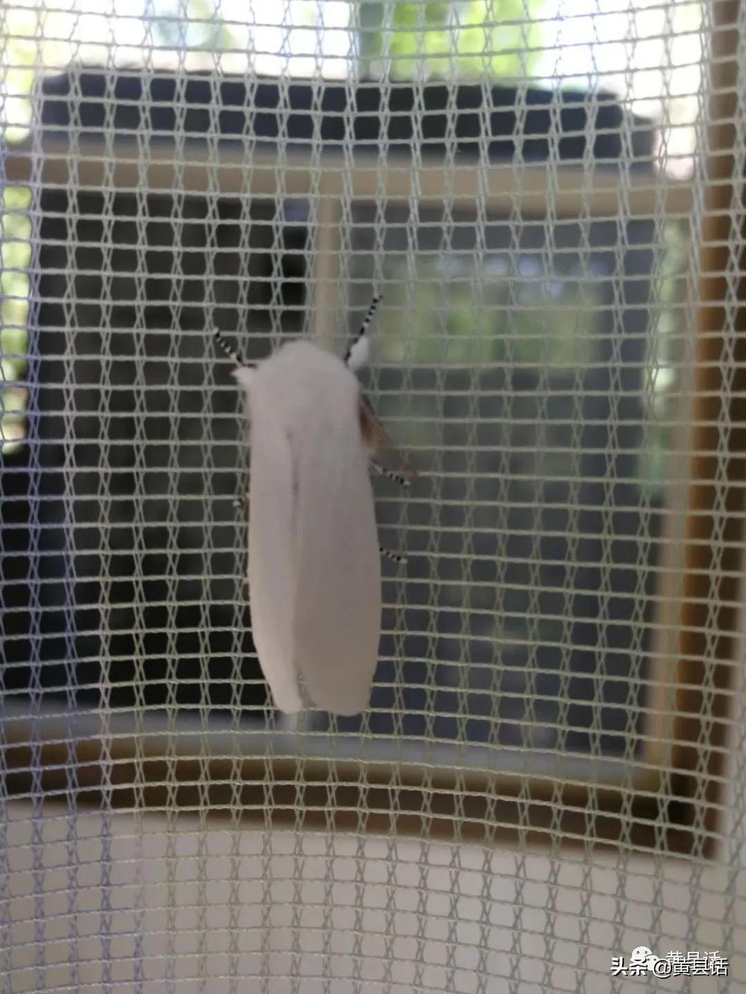 早上起来,在宿舍门口的防虫门帘上看到一只蛾子趴在那里,白雪公主一样,通体雪白,有着丝绢的光泽,只有干白色的触角有几道黑褐色的纹。