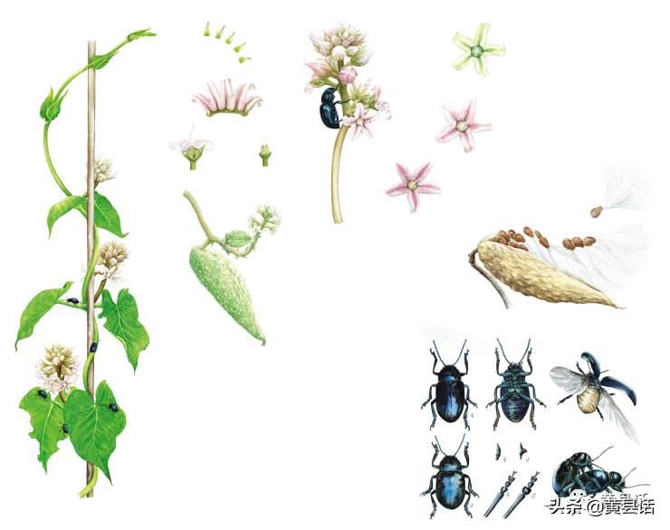 但萝藦肖叶甲也取食花粉、花蜜,在这个过程中也起到了传粉的作用,是非功过又有谁能说得清呢?