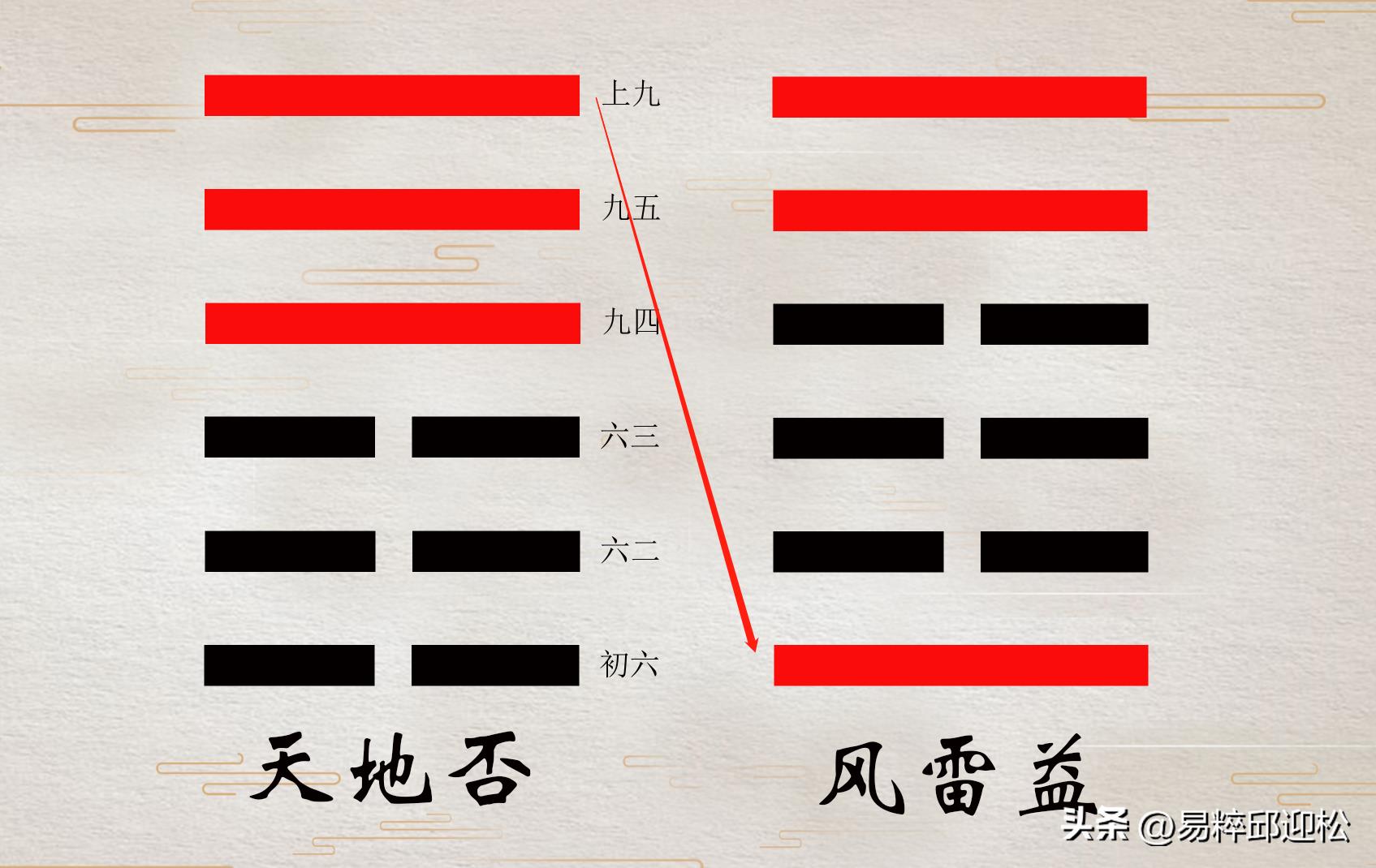 “自上下下,其道大光”,“天施地生,其益无方”,这两句讲的都是益卦的来源,益卦由否卦所变,否卦的上九来到初位,全卦其它爻往上推进一位,就形成了益卦。由高高在上的乾转变为与下位者勠力同心的震,上位者的品德大放光芒,而否卦的下坤卦则往上走,有如大地向上生长,下位者的地位提高,这种增益是没有边界的。阳爻下到初位,处于坤的下面,大地本处低位,所以初九就有下之又下的说法。