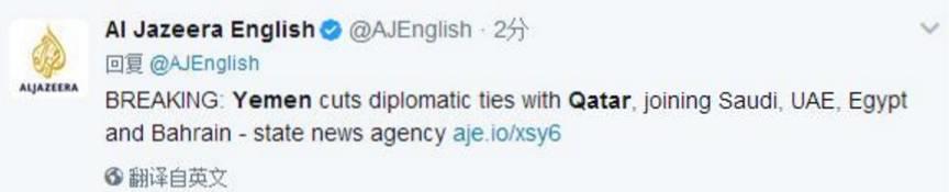 半岛电视台6月5日援引也门国家通讯社消息称,也门当日也宣布与卡塔尔断绝外交关系,并支持停止卡塔尔参加在也门的联军活动。