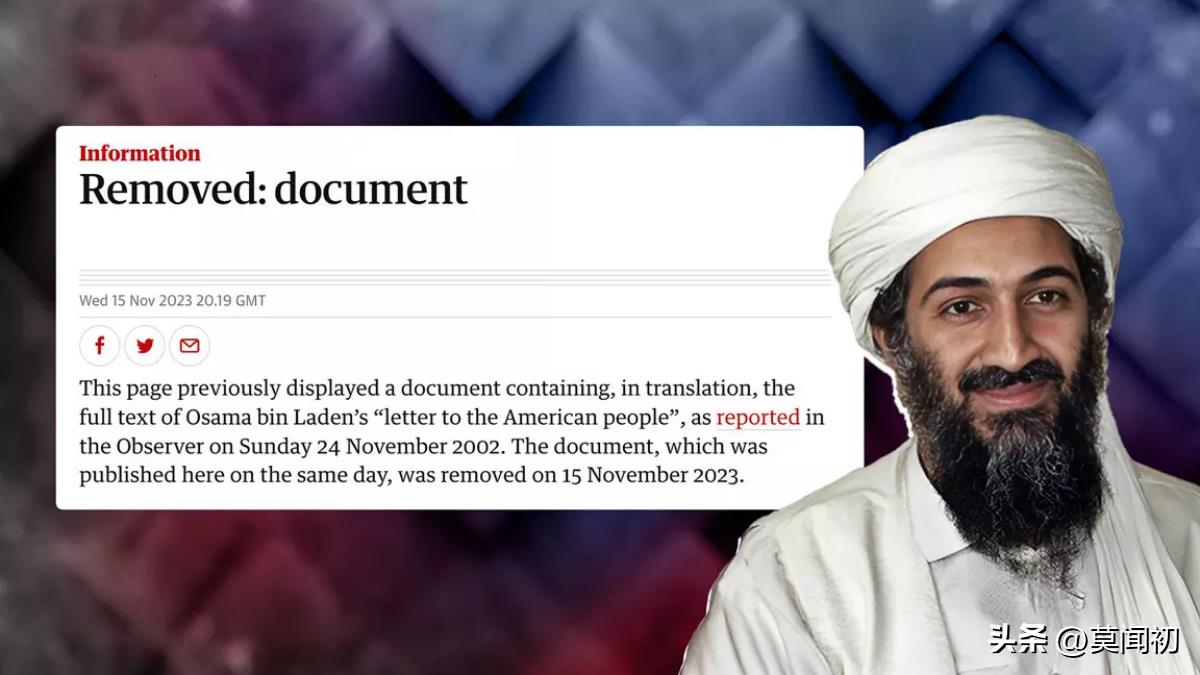 本拉登之所以出名,是因为他在2001年策划了“911”事件,“基地组织”成员劫持两架民用客机,撞向美国世贸中心两座大楼,造成近3000人伤亡。事件发生后,美国非常愤怒,要向“基地组织”复仇,而本拉登这封写给美国人民的信,就是在“911”事件后,为行动所补充的“讨贼檄文”,其中阐述了美英等国在中东犯下的罪行,对巴勒斯坦人民的残酷迫害,以及普通美国人天然负有的责任。