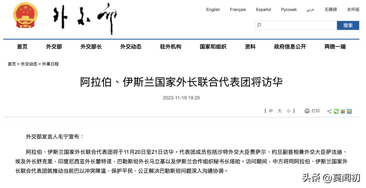 据央视新闻报道,11月19日,中国外交部发言人毛宁表示,阿拉伯和伊斯兰国家外长联合代表团在11月20日至21日期间访华,代表团成员包括沙特、约旦、埃及、印尼、巴勒斯坦等国家或地区的高级外交官。