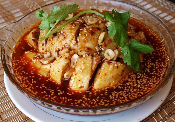 5.将酱油、姜蒜汁、芝麻酱、花椒油、白糖、醋、味精、红油、麻油于碗中对成汁淋在鸡条上,撒上芝麻、花生末、葱花即成。