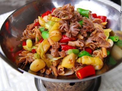 原料:鸡杂1千克,红绿尖椒圈50克。