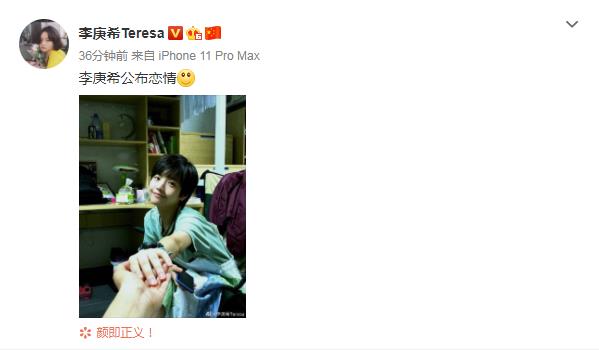 然而令人没想到的是10月11日,李庚希却突然在微博中晒出了一张牵手照,照片中的李庚希坐在树上的椅子上,一手拿着手机,另一只手则牵着另一个人的手,笑得特别的灿烂,同时她还配文称:“李庚希公布恋情”。
