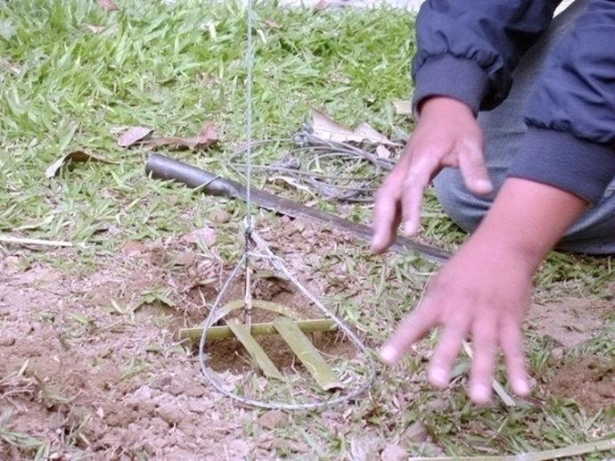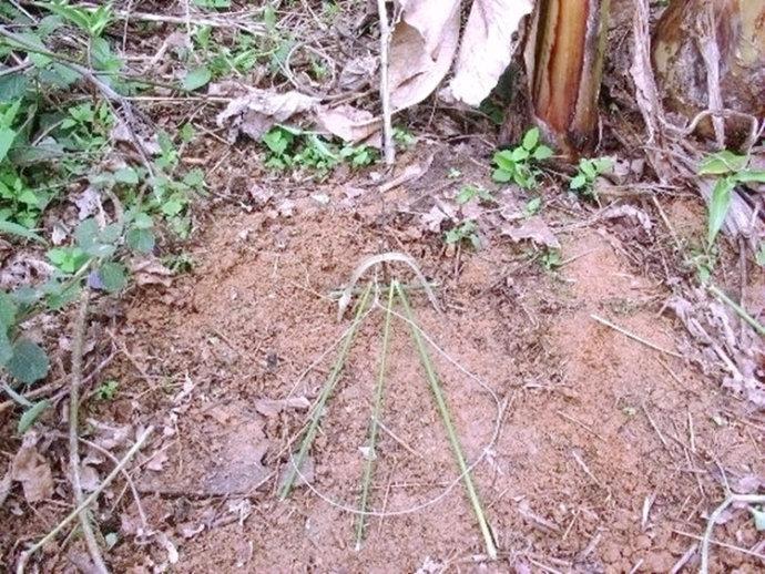 很简单的套子,事实上除了绳子,其他的是竹子和小木棍,原理也很简单,只是利用竹子有弹性的功能。