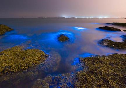 2015年1月22日,中国香港海滩在夜晚发出蓝色荧光,场面奇幻绚丽宛如置身仙境一般。然而,海洋生物学家警告称,这种奇异的蓝色光芒源于水华,其对海洋生物具有危害性。
