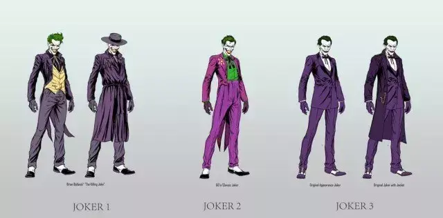 我们能够看出来,这三个小丑的造型我们都十分熟悉,左边的是致命玩笑版,中间是60年代版(白银时代),右边则是黄金时代的版本。