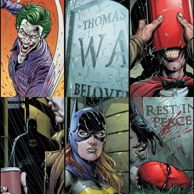 我们来看看上面这张拼图,第1是小丑挥舞着东西砸向某人(二代罗宾?),第2是托马斯·韦恩的墓碑,第3是某人揭开了红头罩的头罩(看衣服的颜色或许是戈登?),第4是蝙蝠侠会面戈登,第5是蝙蝠女,第6则是一块染血的墓碑,下面还有二筒的头罩(也许是杰森·托德的墓碑)。
