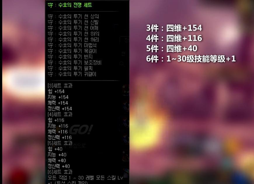 守护气套装三件四维+154,四件四维+116,五件四维+40,六件1—30级技能等级+1。