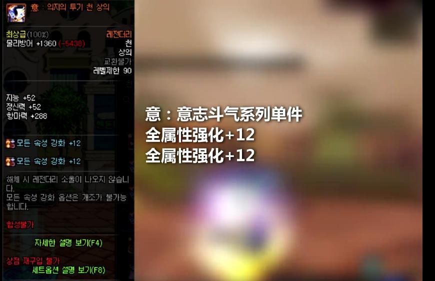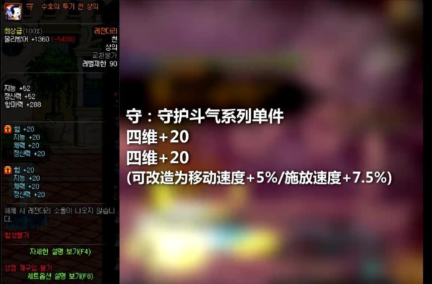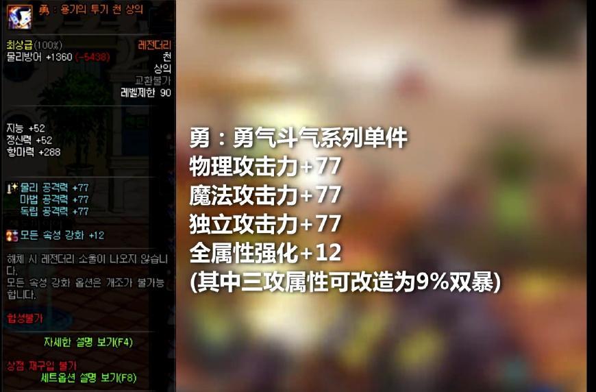 意志气套装单件全属强加24,勇气系列三攻加77,全属强加12,其中三攻属性可以改造为9%双暴击。守护气套装单件四维加40,可改造为移动速度+5%,释放速度+7.5%。