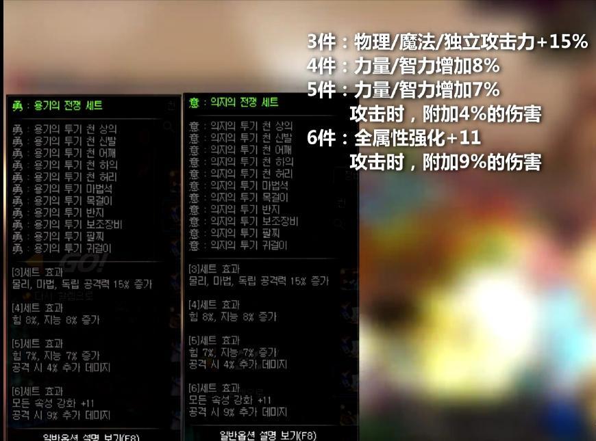 意志气套与勇气套套装属性相同,三件套三攻+15%,四件套力量智力增加8%,五件套力量智力增加7%,4%的白字,六件套全属强加11,9%的白字。