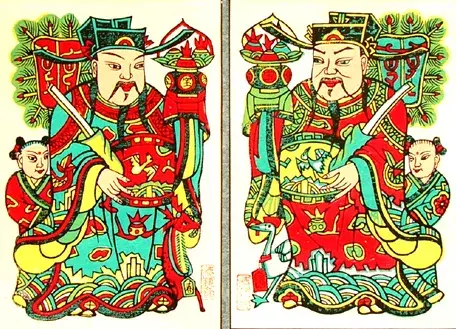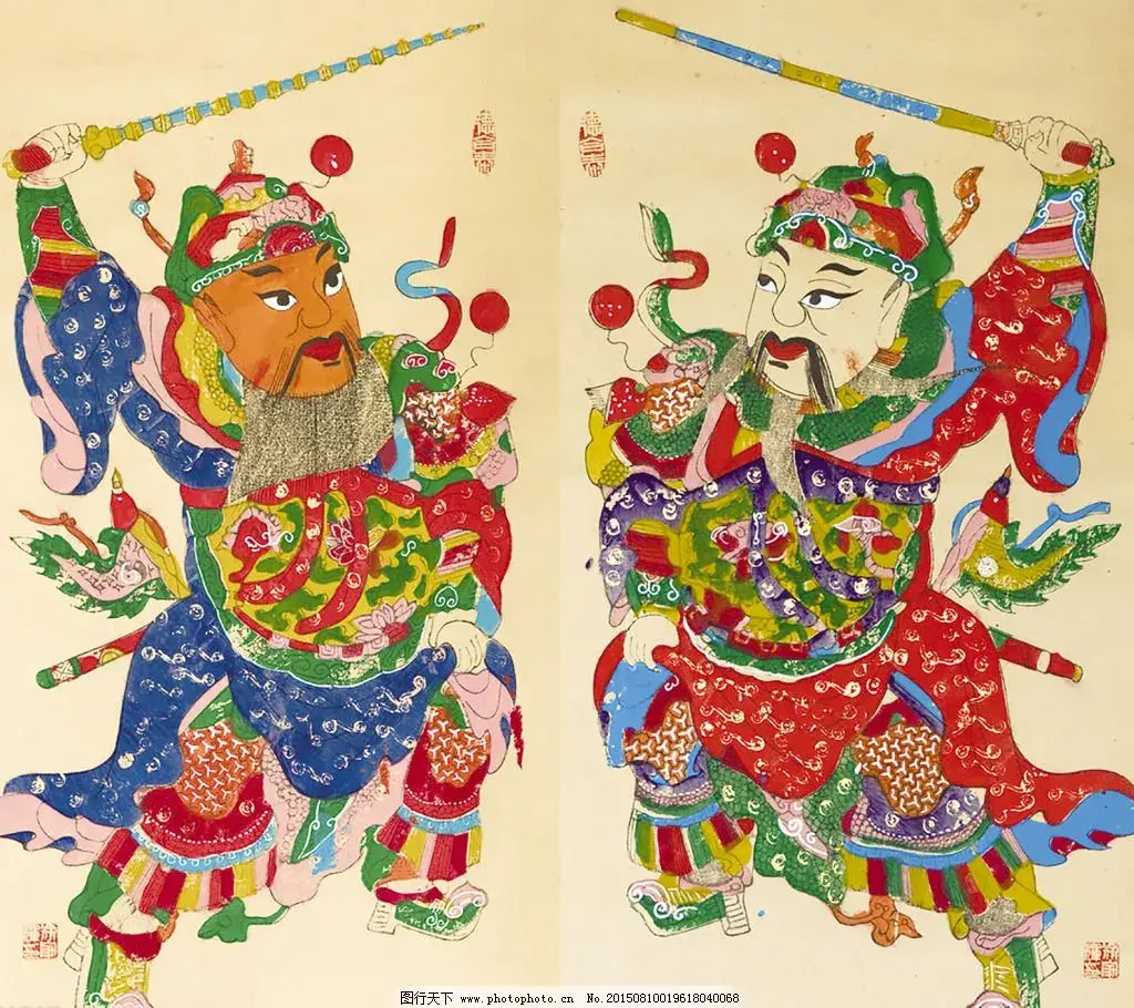 门神又分文门神和武门神,文门神一般文官打扮,手持如意、官帽、金银财宝等,寓意升官发财,加官进爵。武门神一般武官打扮,穿有盔甲,手持兵器,寓意驱邪避鬼,卫家宅保平安,降吉祥。