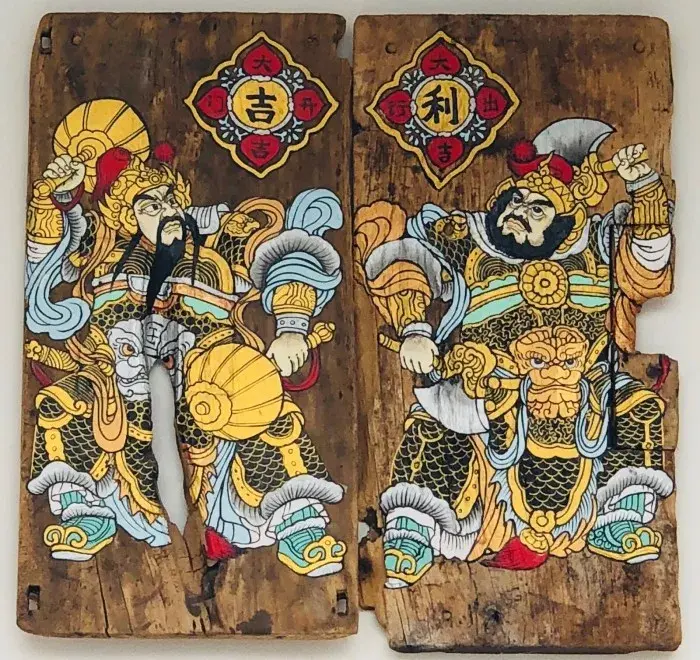 门神的前身是桃符,古人认为桃木是五木之精,有辟邪之功效。桃木的辟邪之意,也与神荼、郁垒在大桃树下捉鬼有关,最常见的方法是将神荼、郁垒的名字刻于桃木上,或将桃木雕刻成神荼、郁垒的模样,悬挂于门前,给民间百姓以心灵寄托,祈求平安幸福。