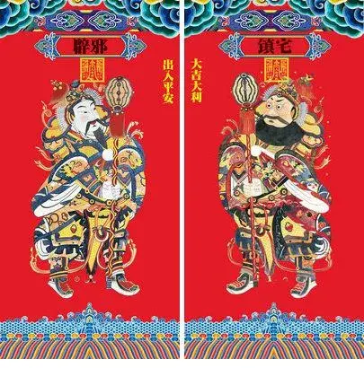 在后来的发展中,门神的形象逐渐丰富多彩,出现了秦琼、尉迟恭、钟馗、赵公明、张飞、关羽等历史人物和神话人物。这些人物通常被描绘成勇猛无畏、忠诚坚定的形象,寓意着保护家庭和平安。