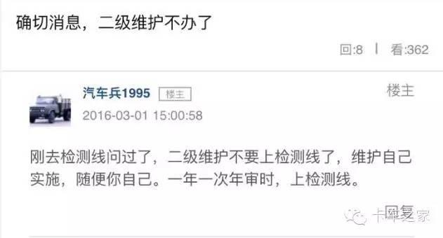 确切消息,二级维护不办了。刚去检测线问过了,二维不要上检测线了,维护自己实施,随便你自己。一年一次年审时,上检测线。