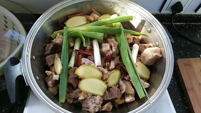 5、入温开水至没过鸡肉,下料酒、酱油、葱姜蒜、干辣椒、豆泡、木耳、香菇后大火烧开。
