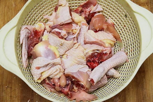 1、把柴鸡内外洗净后斩成5厘米见方的大块备用。