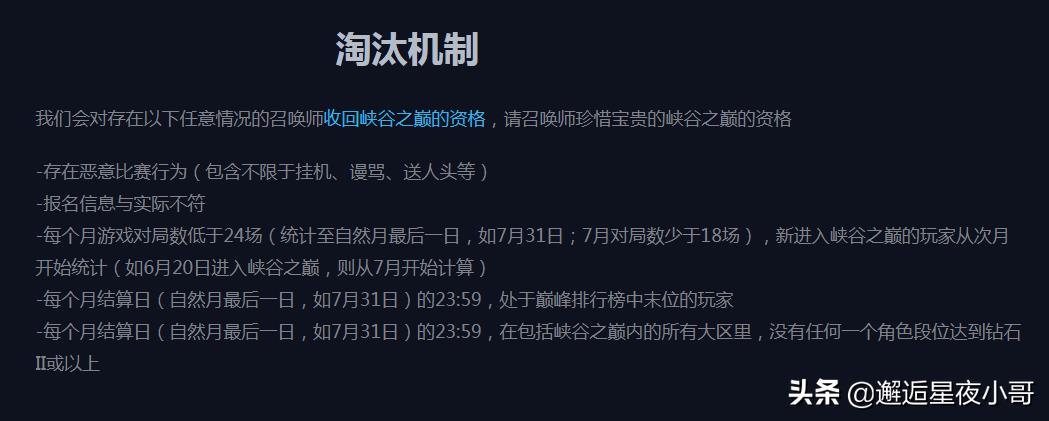 因为峡谷之巅有淘汰机制,每个月都要对局次数超过24场,所以不适合长时间不玩的朋友。(但我相信很多人一个月远超过这个场次,哈哈)有时间,哪怕是工作后每个工作日打1场也够资格免于淘汰。不适合喷人,挂机,送人头的恶意玩家。总而言之就是,适合有时间有素质的“高手”前来挑战。