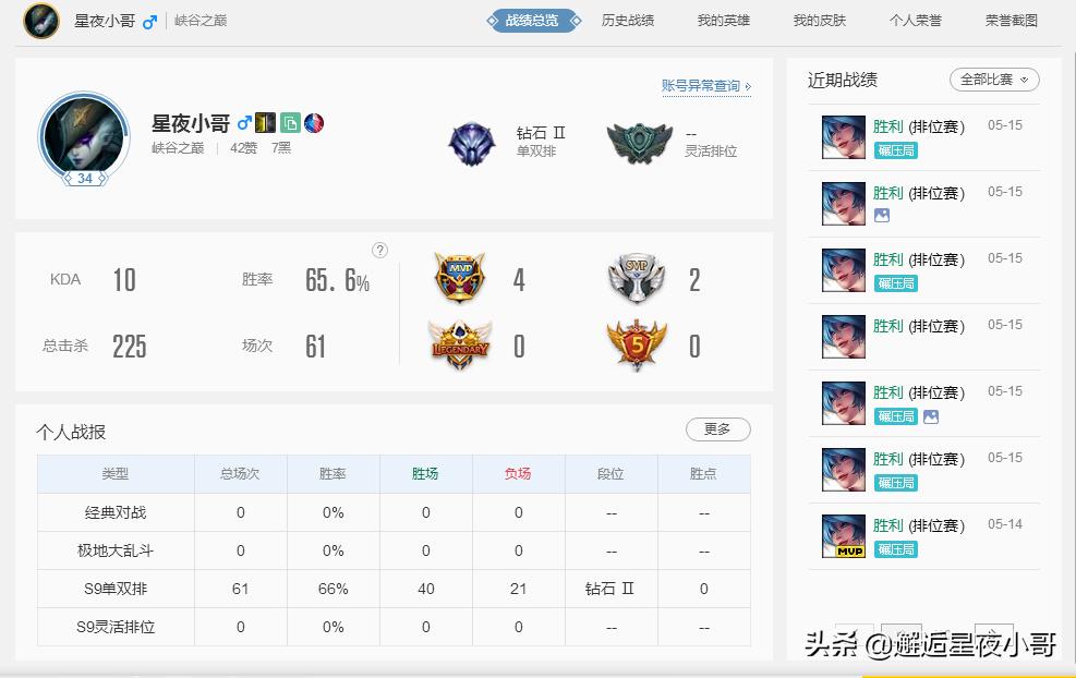 峡谷之巅从铂金2到钻石2只用61把。(据我所知,峡谷之巅最低段位是铂金3)