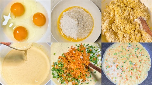 食材准备:面粉、燕麦麸、鸡蛋、胡萝卜、香葱、牛奶