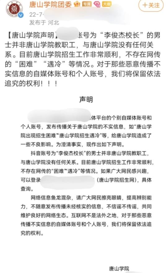 唐山学院发文澄清,称今年招生很顺利,“网红校长”终于自曝身份