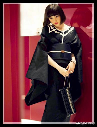 其实除了针织衫和短裤的搭配,她穿和服也有另一种风韵,还是黑色日本发,可爱的表情,纯黑色的和服一改她可爱清丽的风格,有种日本传统服饰的大方和端庄,黑色的手包带点时尚的味道,很有模有样。