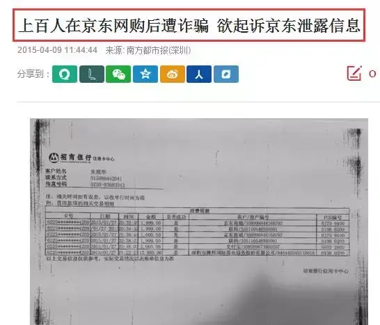 4月份,南方都市报更是发表题为《上百人在京东网购后遭诈骗 欲起诉京东泄露信息》的文章,指出100余名受骗者自发组建维权QQ群,集体讨伐京东。