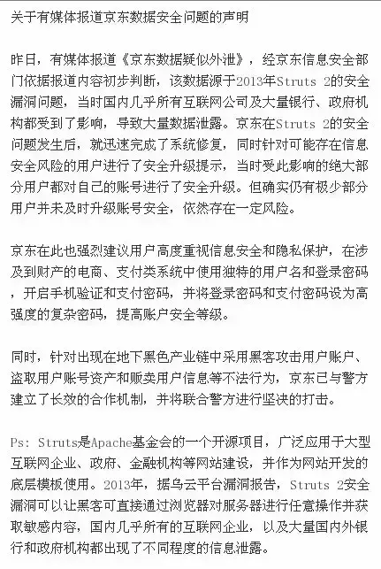 京东方面并未否认这些数据来自于京东。但其回复称,2013年Struts 2的安全漏洞问题,使当时国内几乎所有互联网公司及大量银行、政府机构都受到了影响,导致大量数据泄露。