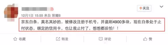 12月1日,网友发贴称,京东被修改注册手机号,白条被盗刷4900元。