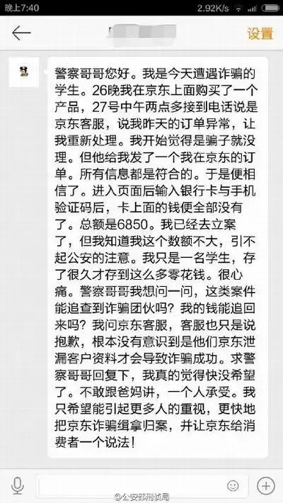 同年3月14日,一名学生向公安部刑侦局求助,自称在京东下单后,接到自称“京东客服”来电,以订单异常为由让他重新处理订单,结果被划走6850元。