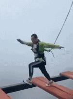 4、当快接近地面时,右臂向前弯曲,勒紧绳带两腿委曲,两脚尖先着地。