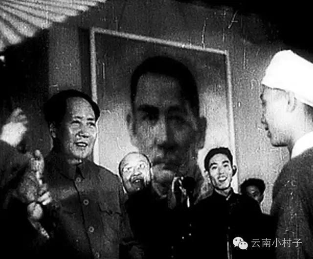 召存信和刀世勋一起向毛主席进献金伞/版纳州委宣传部供图